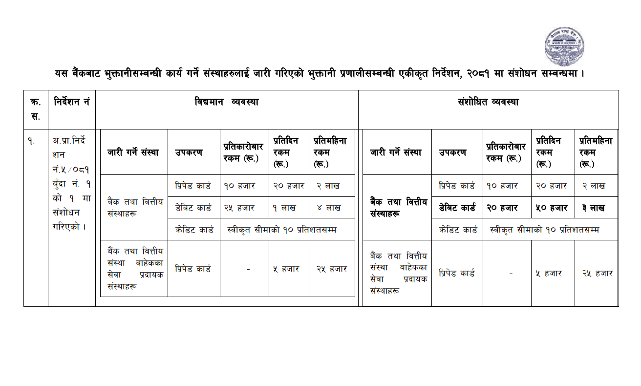 त्यस्तै मासिक ३ लाखसम्म निकाल्न पाउने व्यवस्थालाई पनि घटाएर दुई लाखमा सीमित गरेको छ । तर प्रिपेड कार्ड र क्रेडिट कार्डको सीमा भने यथावत् राखेको छ ।