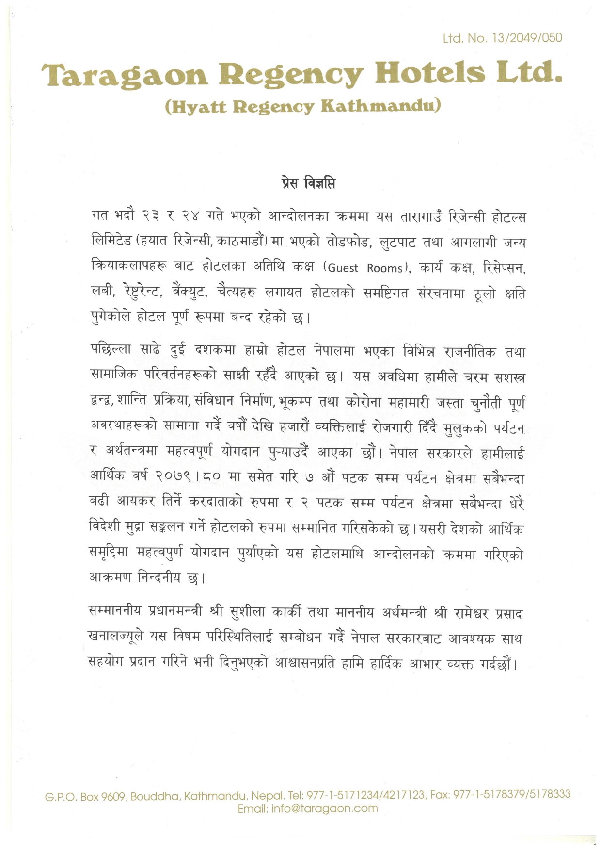 काठमाडौँ । पाँच तारे होटल तारागाउँ रिजेन्सी होटल्स (हायात रिजेन्सी काठमाडौँ)ले जेनजी आन्दोलनका क्रममा होटलमा ठूलो क्षति भएको उल्लेख गर्दै पुनःनिर्माणपछि यथाशीघ्र सञ्चालनमा आउने बताएको छ ।